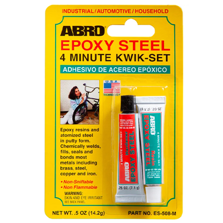 Клей содержит эпоксидные смолы и измельченную сталь. Применяется для химической сварки, заполнения, герметизации и склеивания дерева, пластика и большинства металлов, включая латунь, сталь, медь, железо, и т.п. Надежно склеивает и обеспечивает хороший внешний вид. Устойчив к бензину, антифризу и большинству растворителей. Эпоксидный клей может применяться для: сломанных велосипедов, растрескавшихся картеров коробки передач, тормозных колодок, всасывающих труб, поврежденных шпоночных канавок, трещин в обшивке, растрескавшейся батареи, бензобаков. Объем 14,2 г