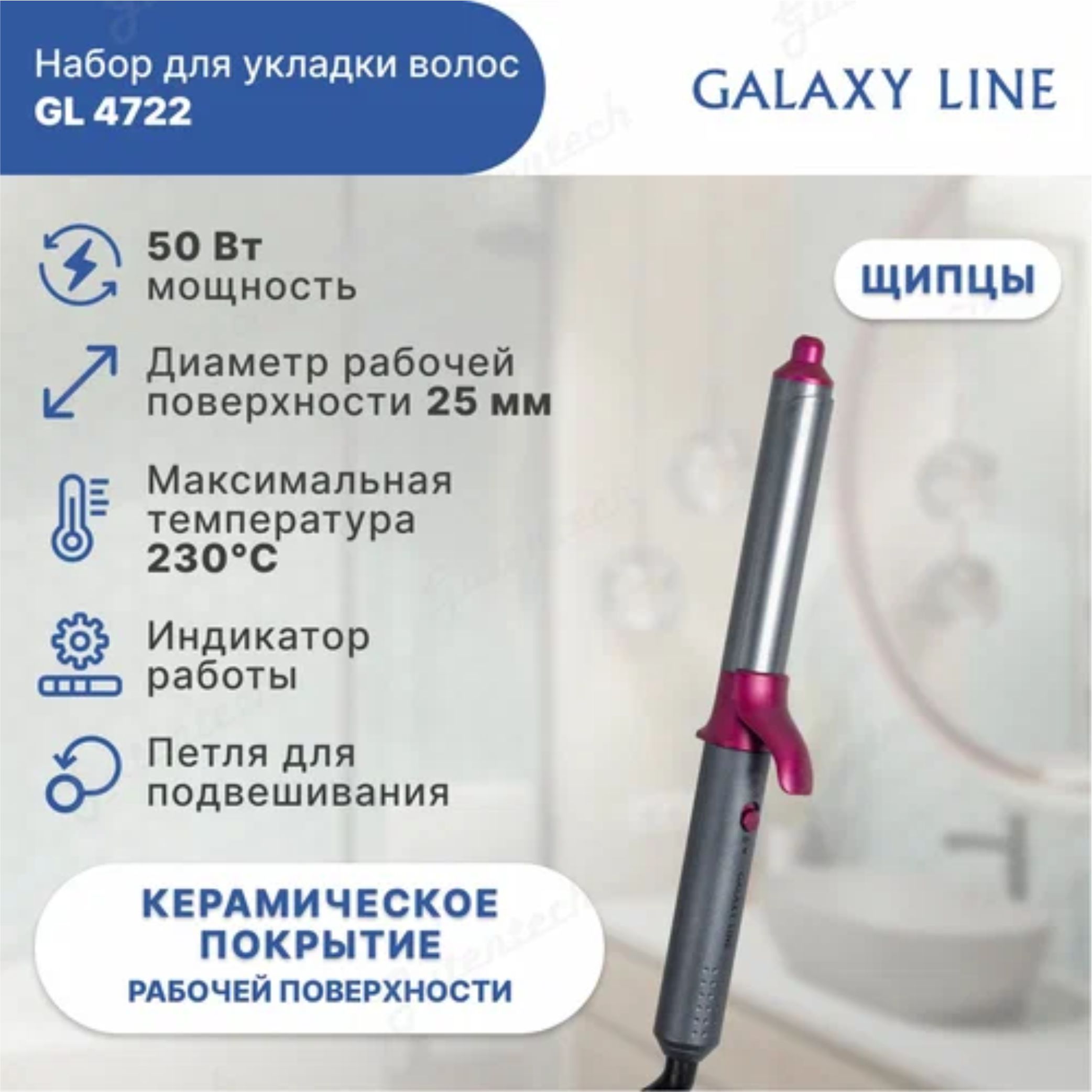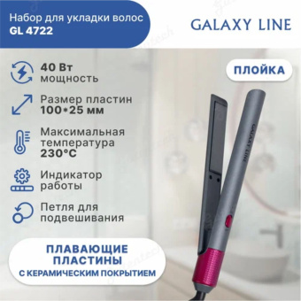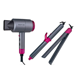 В набор входит: фен GL4722/1 2000 Вт, щипцы GL4722/2, 40 Вт, плойка GL4722/3 мощность 50 Вт