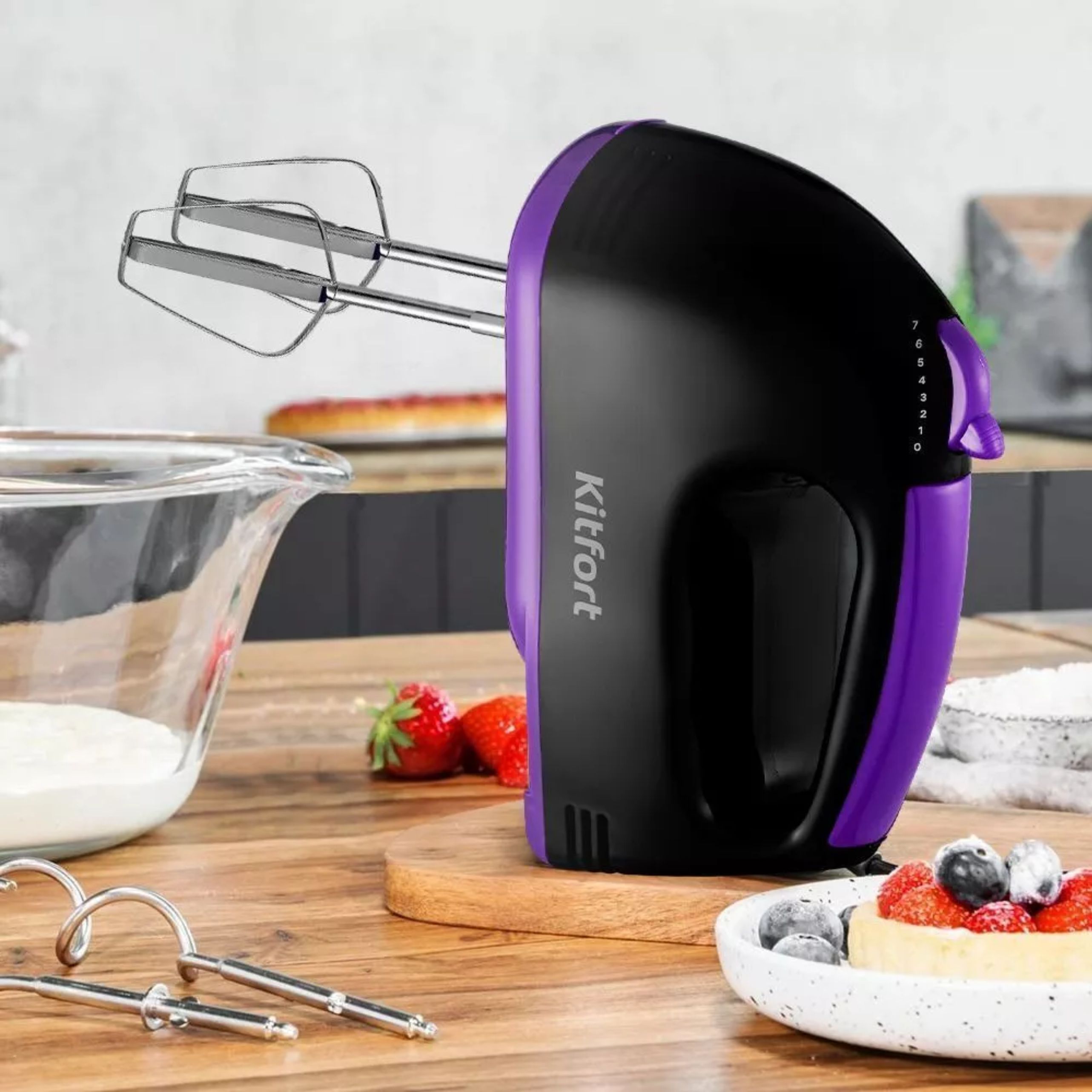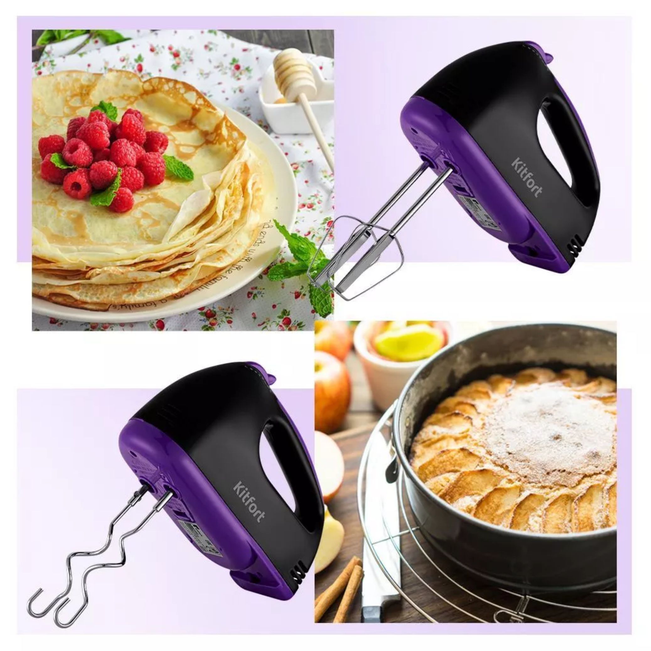 Ручной миксер Kitfort KT-3404 поможет вам смешать ингредиенты, взбить яичный белок или сливки, приготовить картофельное пюре, соус, крем, мусс, замесить жидкое тесто. В комплекте идут насадки для взбивания и перемешивания.