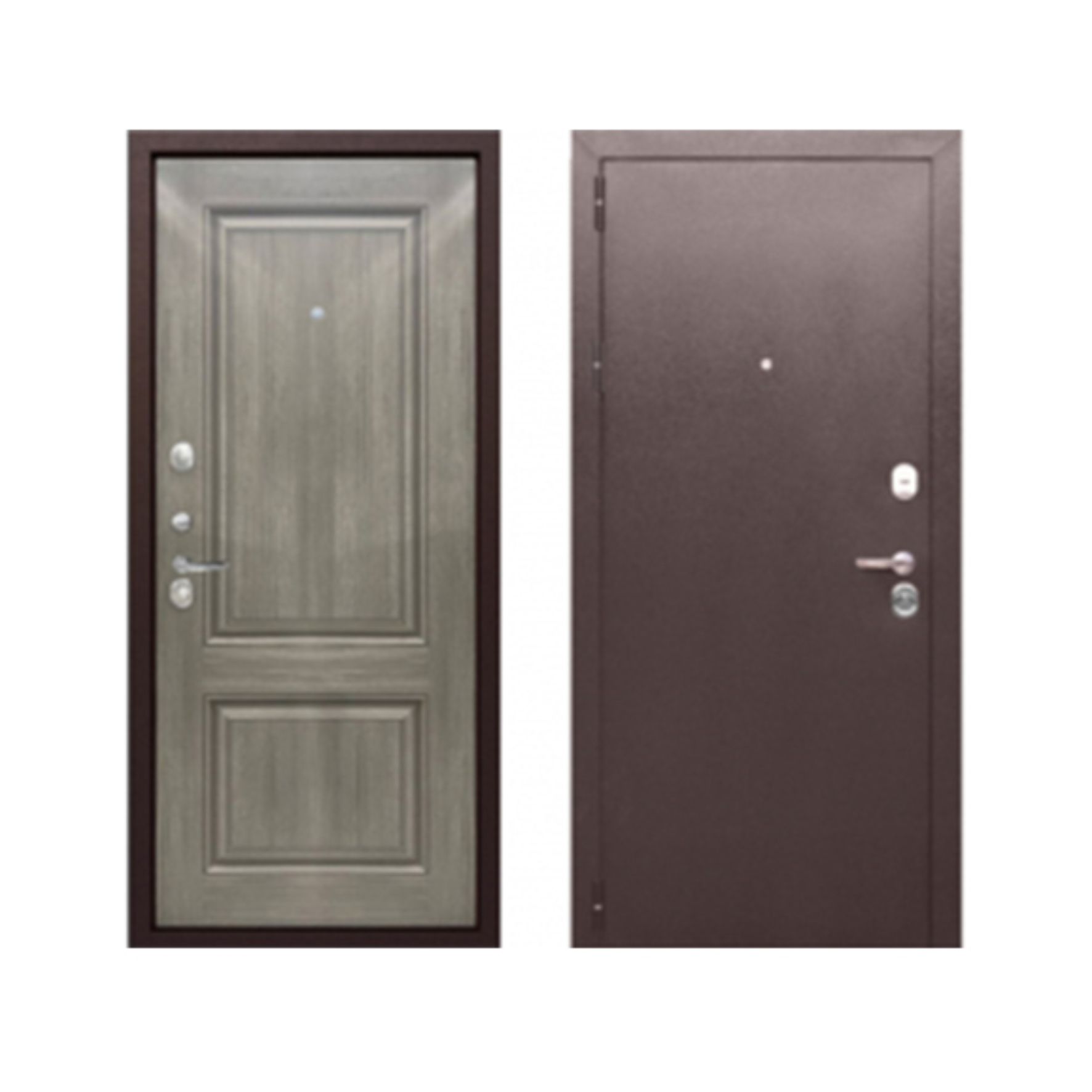 Внешнее покрытие: атмосферостойкое порошково-полимерное «Медный антик»Внутреннее покрытие: фрезерованная МДФ-панель 10 мм, цвет серый кленТолщина дверного полотна: 90 мм