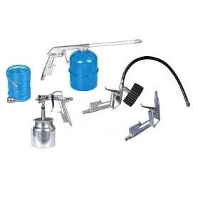 В наборе: пистолет для накачки шин, краскораспылитель, спиральный шланг, продувочный пистолет, промывочный пистолет