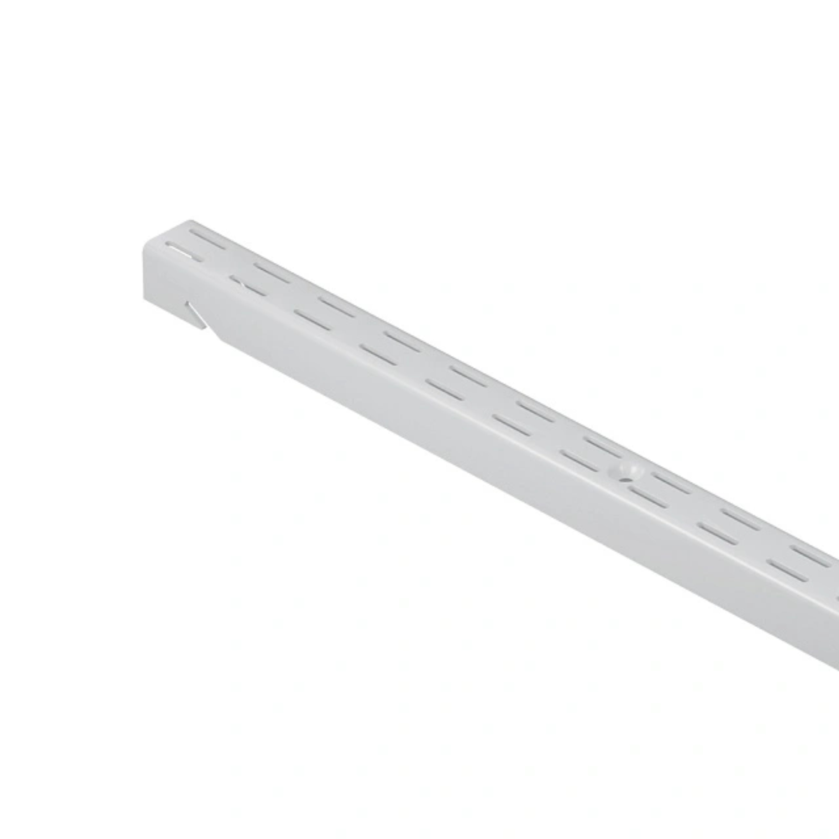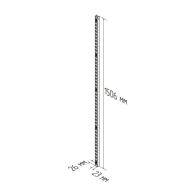 Белая металлическая стеновая стойка. Один из основных элементов системы хранения, на который навешиваются кронштейны и функциональные элементы для хранения. Максимальная нагрузка 100 кг. Размеры 26x1506x23
