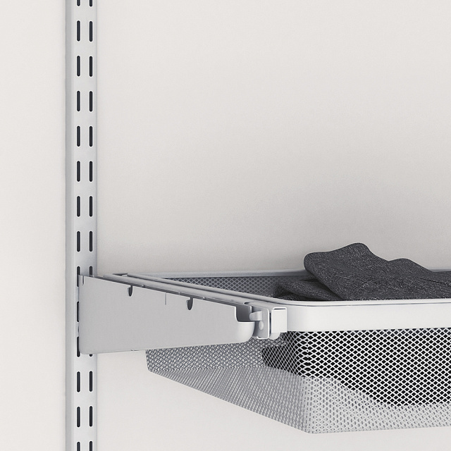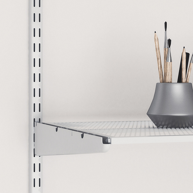 Через специальные пазы повесьте стойку на закрепленный к стене рельс. После установки всех элементов системы хранения зафиксируйте стойки крепежом, соответствующим типу стены, через специальные отверстия вдоль стоек.