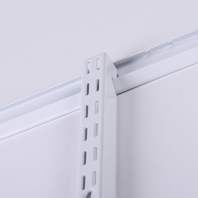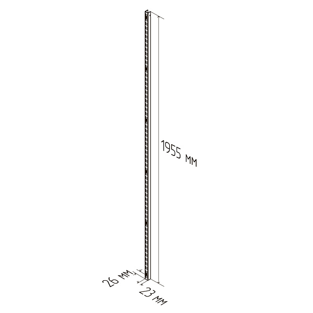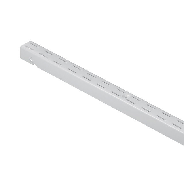 Белая металлическая стеновая стойка. Один из основных элементов системы хранения, на который навешиваются кронштейны и функциональные элементы для хранения. Максимальная нагрузка 100 кг. Размеры 26x1955x23.
