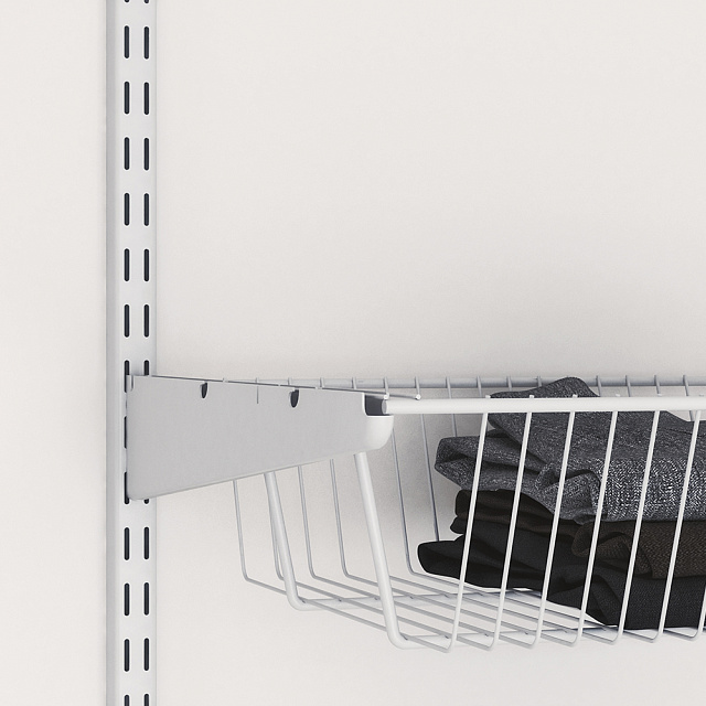 Через специальные пазы повесьте стойку на закрепленный к стене рельс. После установки всех элементов системы хранения зафиксируйте стойки крепежом, соответствующим типу стены, через специальные отверстия вдоль стоек.