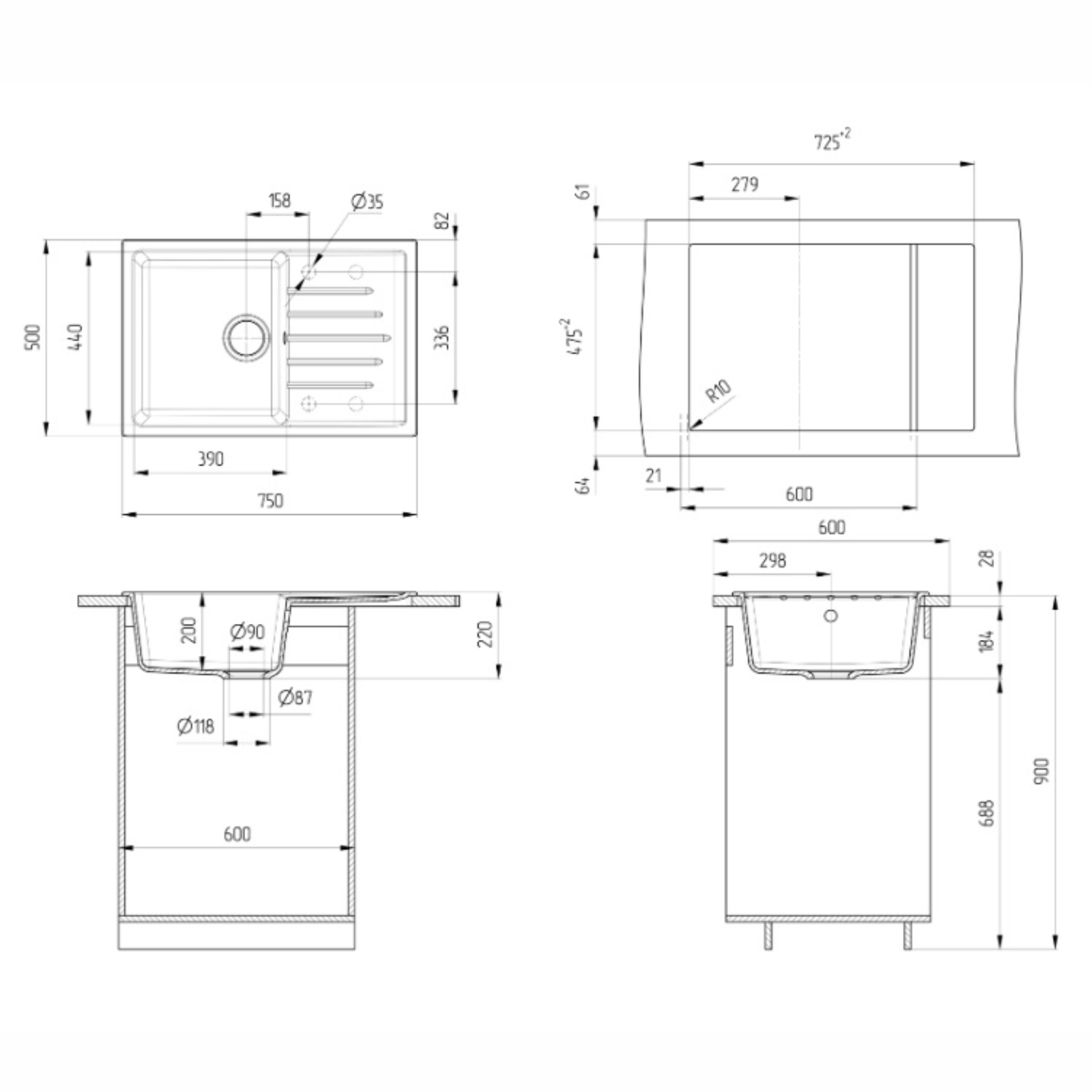 Мин. ширина шкафа для монтажа мойки: 60 см