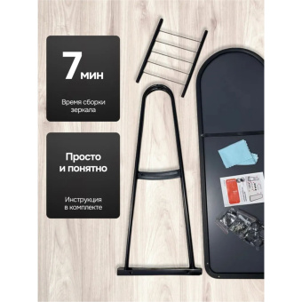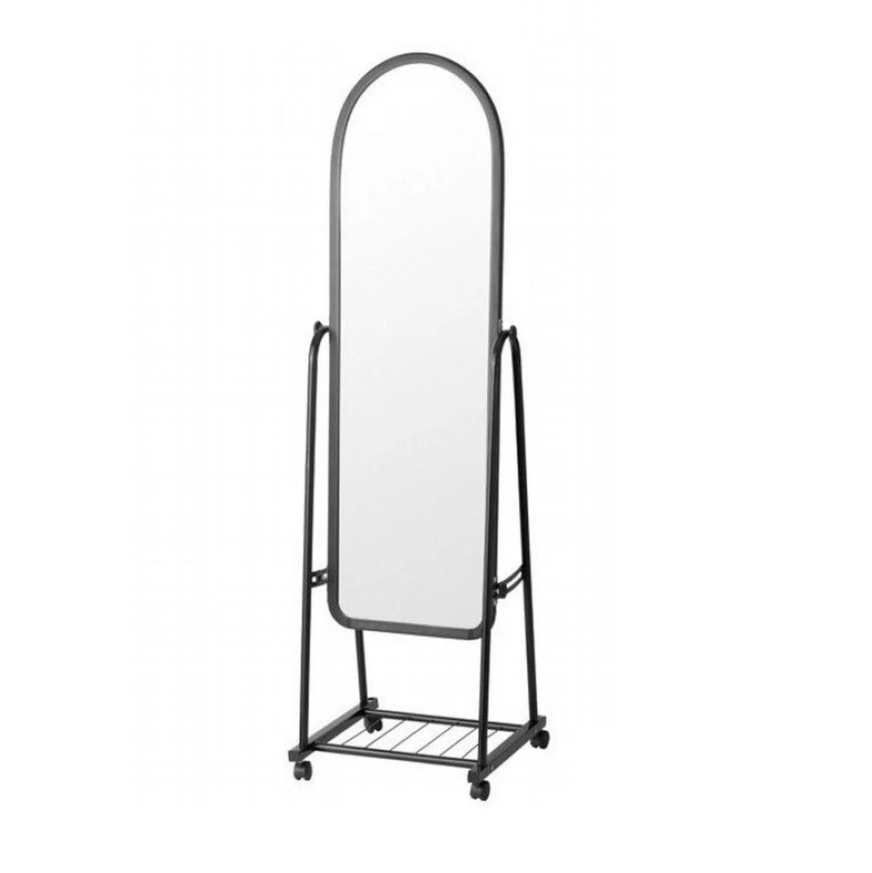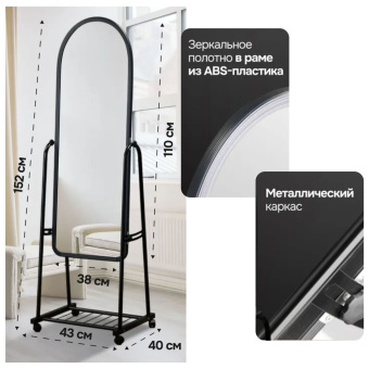 Зеркало во весь рост оснащено удобными и прочными колесиками для перемещения. Регулируемые ручки позволяют наклонять его под нужным углом. Напольное зеркало на колесиках изготовлено из прочных материалов, устойчиво на плитке, кафеле, ламинате. Модель оснащена полочкой для обуви, коробок, разных мелочей.