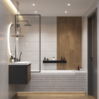 Рельефная настенная плитка Vetro станет эффектным дополнением одноимённой коллекции. Матовый материал под камень с горизонтальными полосами добавит объёма помещению. С помощью этой плитки можно обозначать функциональные зоны и отделять базовую плитку разных цветов. Настенную плитку Vetro рекомендуется использовать с керамогранитом теплых цветов под дерево.
