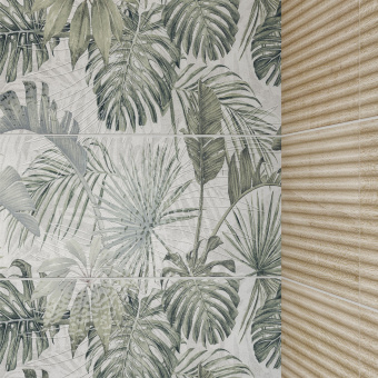 Естественная и динамичная коллекция настенной плитки Urbano создана для тех, кто ценит соприкосновение с природой, но любит жить в городе с его урбанистичной бетонной эстетикой. Плитка с плоской и рельефной поверхностью создаёт игру света и объёма в пространстве. Этот эффект поддерживает и блеск на поверхности декора — панно с растительной тематикой. На пол дизайнеры рекомендуют уложить «бетонные плиты» или «деревянные доски» керамогранита для завершения задумки.