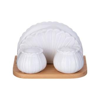 Комплект: соль, перец, салфетница на деревянной подставке