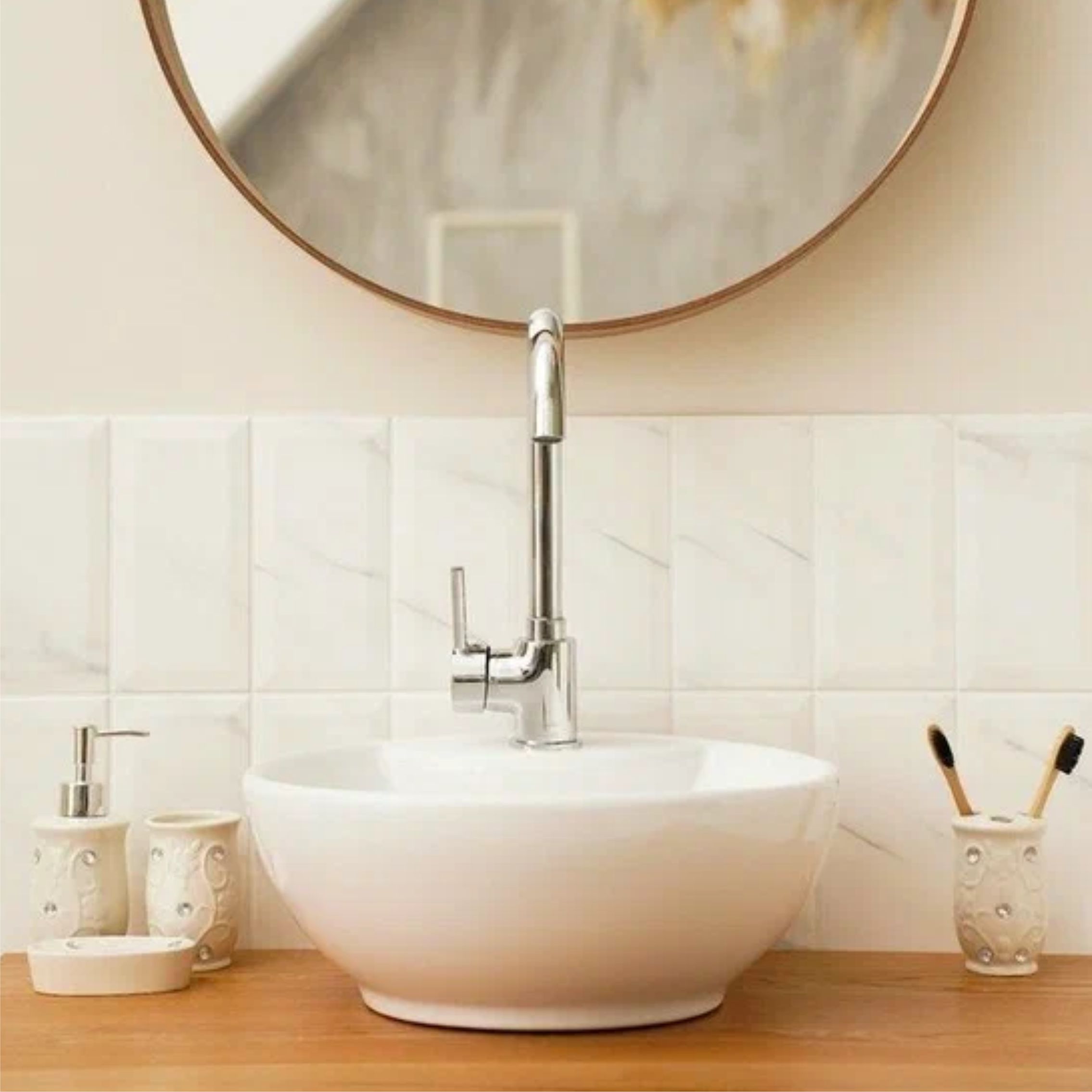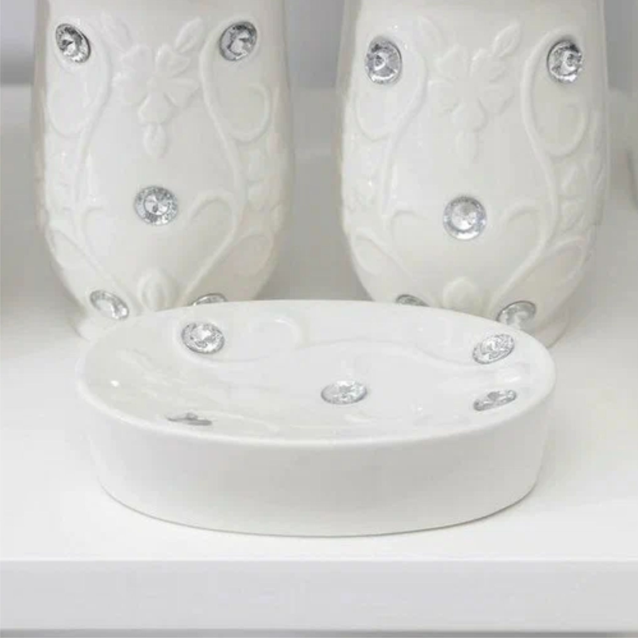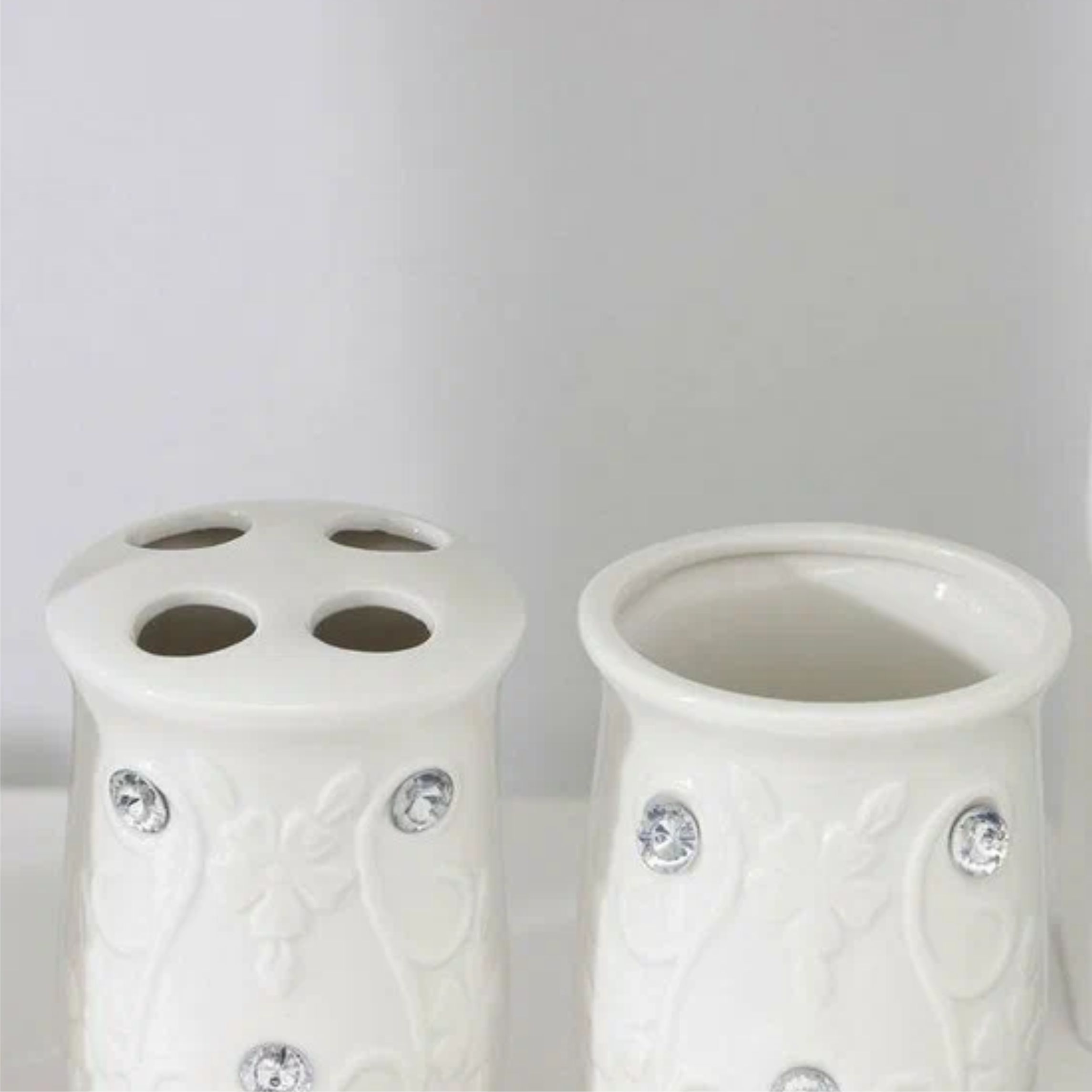 Комплектация состоит из 4 предметов: мыльница, дозатор для жидкого мыла, стакан для щёток, стакан для пасты.