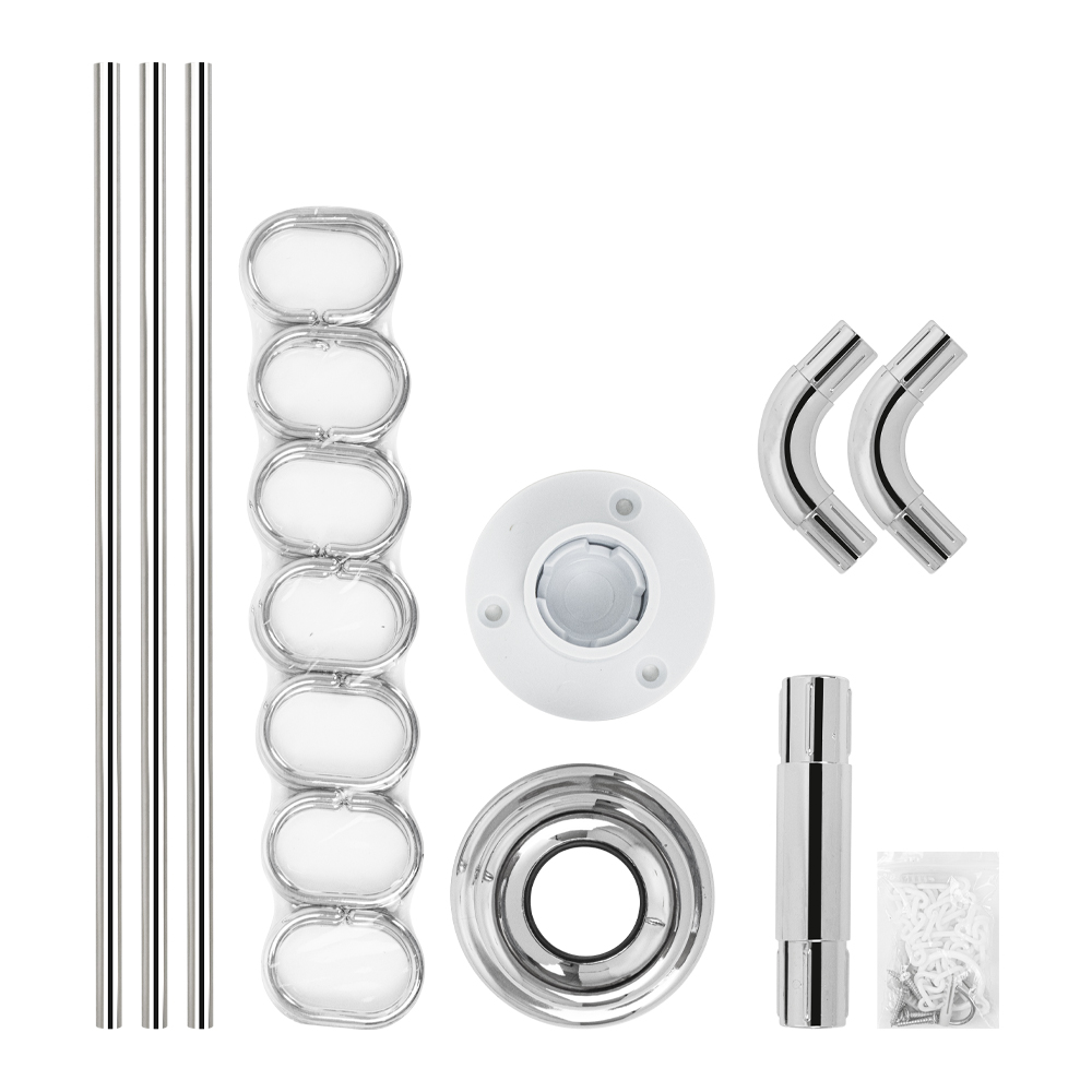Карниз в ванную угловой. Универсальный, П и Г - образная система, изготовлена из алюминиевых трубок и пластиковых составных креплений. Изделие в собранном виде имеет усиленную (диаметр 25 мм) конструкцию размером 90 x 90 x 90 см, которая поддерживает/направляет шторку и позволяет прикрывать с трёх сторон место приёма водных процедур.