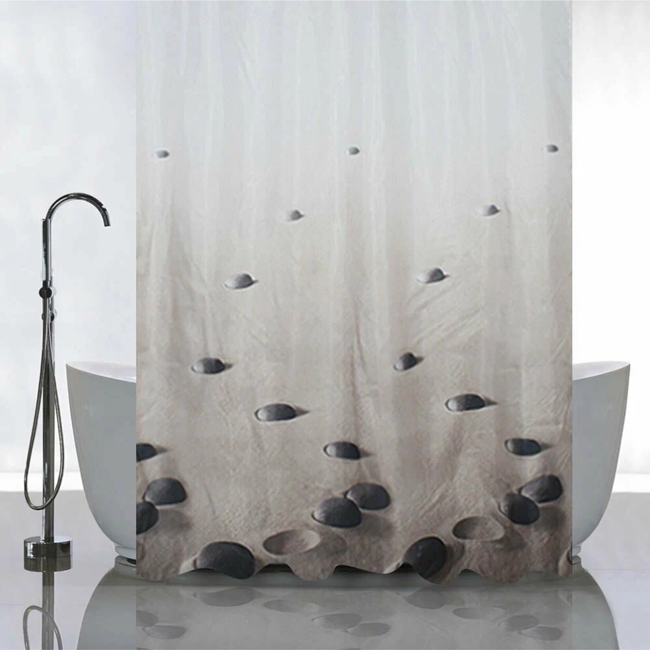 Красиво декорированная шторка в ванную и душевую комнаты с рисунком, защищающая пол и оборудование ванной комнаты от брызг воды, изготовлена из полиэстера и обладает выраженными водоотталкивающими свойствами. Занавеска для ванной имеет в верхней части 12 отверстий с пластиковыми люверсами. Декоративный рисунок нанесён на поверхность ткани при помощи фотопечати. Такие принты не боятся влаги и не смываются даже очень горячей водой. Водоотталкивающие шторы для ванной, пошитые из ткани плотностью 80 г/м2, не придётся дополнительно утяжелять — они расправятся под своим весом и не будут липнуть к телу принимающего душ человека.