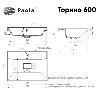 Врезная раковина Paola Торино (Torino) 600 с отверстием под смеситель и декоративным элементом на сливе имеет современный, стильный и эргономичный дизайн. Возможна установка раковины на тумбу (вровень) или на столешницу.